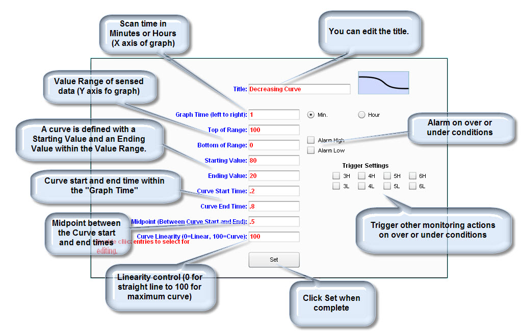This is the "Decreasing Curve" configuration screen. The "Increasing Curve" configuration screen is similar, with the exception that the Starting Value for a Decreasing Curve must be greater than the Ending Value; and vise versa for the Increasing Curve: