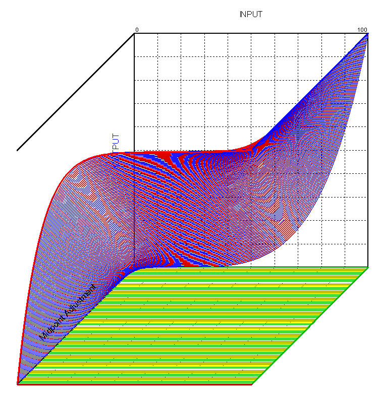 This is an accumulation of two curves: a convex curve whose slope goes from vertical to horizontal and is limited to a value defined by the "Midpoint Amplitude Adjustment" and a second curve whose slope goes from horizontal to vertical across the entire range of the "INPUT" modified value. With the "Midpoint Amplitude Adjustment" position set at 50%, the curve is symetrical as shown in the first graph.