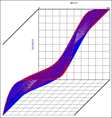 The graph below shows the SConcaveConvex curve with the midpoint set at 50 and running the ConcaveConvex Config input through its entire range.